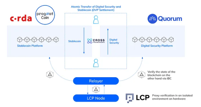 下图为MUFG使用稳定币进行数字证券的跨链结算,左边的Corda区块链层负责处理稳定币(Progmat Coin),右边的Quorum平台负则处理数字证券,而中间通过Cross Framework来实现原子结算(也就是传统金融的DVP交割)。