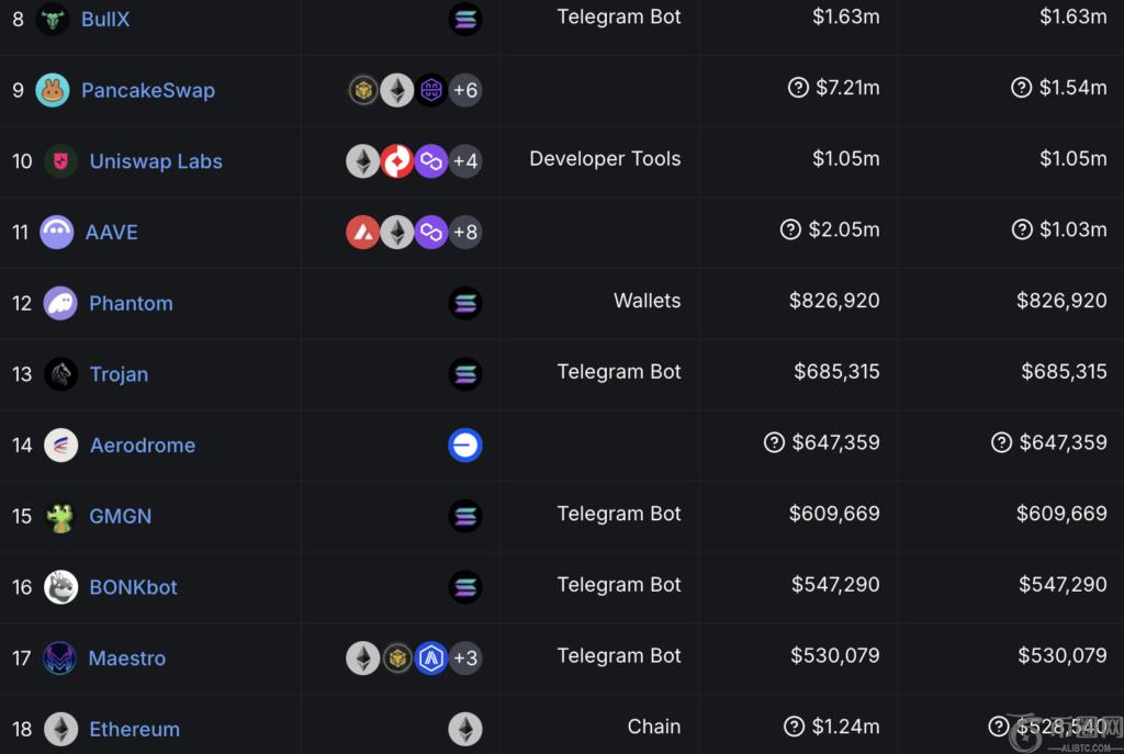 以太坊在24小时的收入中排名**8位,仅次于Solana Trading Bots Bonkbot,Maestro,Trojan和Bullx。