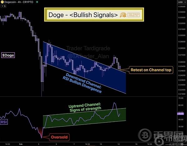 RSI 的上行趋势通道强化了这一点,表明尽管 DOGE 的价格通道呈下行趋势,但仍具有增强的势头。