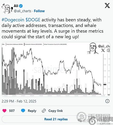 DOGE 网络活动激增,推动狗狗币表现的一个关键因素是网络活动的增加。根据马丁内斯发布的数据,狗狗币的网络活动一直在稳步增长,每日活跃地址、交易量和鲸鱼活动都处于高位。分析师指出,这些数据表明该资产即将迎来上涨趋势。