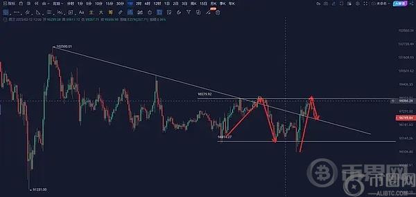那下方又是假跌破价格又马上继续的反弹,一下子价格又是回到了98000美元附近,甚至也是突破了之前的这个下降的趋势线,但是现在突没没突破这个趋势线已经没有那么关键了,可以观察到再度回调陷入震荡行情,所以当前的上方阻力位还是在这个地方附近。