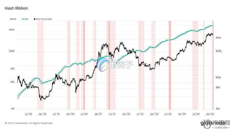 bitcoindata21指出,比特币哈希带(hash ribbon)指标显示,当前比特币矿工正面临新的投降阶段,比特币或许已经触底,反转即将到来:哈希带是一个市场指标,当比特币挖矿成本相对于挖矿所需的费用变得过高时(矿工将被迫关闭矿机),矿工就会进入投降阶段,此时往往预示着比特币触及底部。当30日移动平均算力线突破60日移动平均算力线时,表明矿工投降的最糟糕时期已经结束。