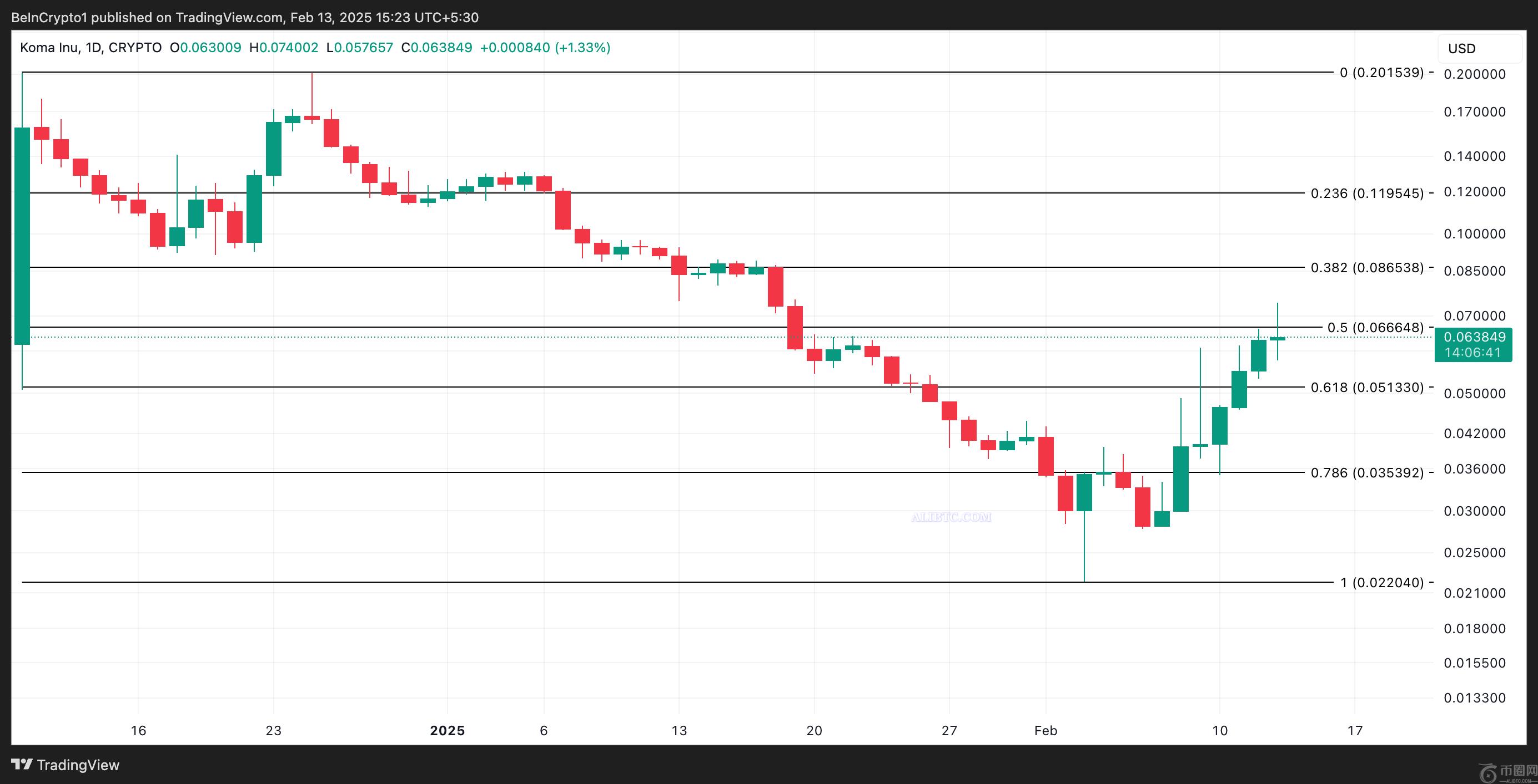 此次两位数的上涨标志着 KOMA 价格上涨趋势的延续,该涨势始于 2 月 3 日跌至 0.022 美元的历史低点之后。自那时起,该 meme 币的价值飙升了 186%。