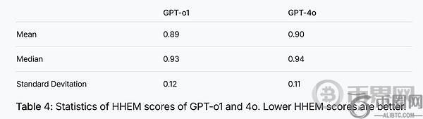 图:GPT-o1和4o的HHEM分数统计,HHEM分数越低幻觉越低