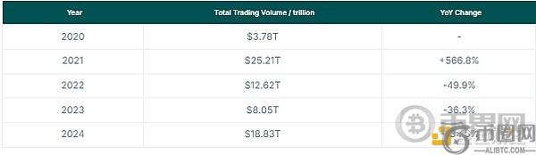 2021 年是交易量最多的一年,创下 25.21 万亿美元的历史新高。这比 2020 年的 3.78 万亿美元交易量增长了 566.8%(21.43 万亿美元)。