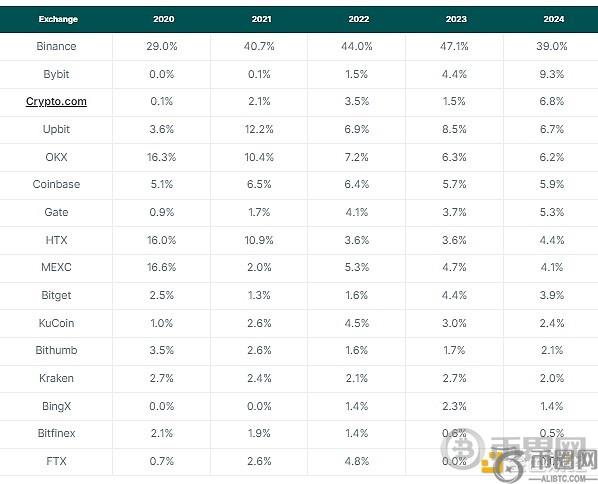 2020 年至 2024 年前 15 大加密货币交易所市场份额