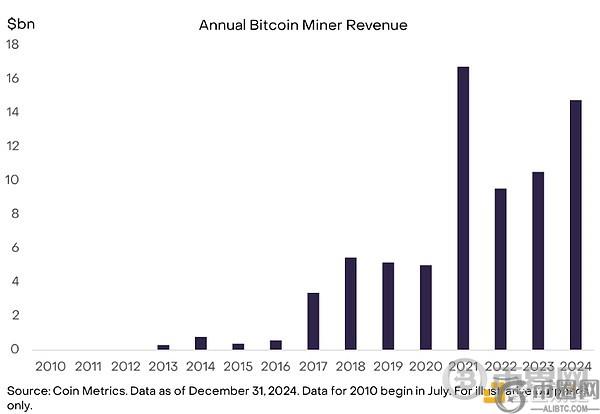 2024 年,矿工们总共赚了约 230,000 比特币,价值近 150 亿美元(按同期价格计算)。[9] 这比 2014 年增长了约 19 倍,年复合增长率为 34%(图表 2)。新发行的比特币的速度每四年就会下降一次,这一事件被称为比特币减半。尽管以比特币计算的发行量有所下降,但由于以美元计算的比特币价格升值,挖矿收入随着时间的推移而增加。未来,采矿收入的增长可能来自比特币价格上涨和/或网络交易费用的增长。