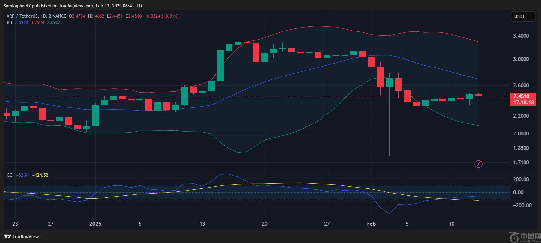 目前,XRP以2.45美元的价格易手,昨天收益2.5%后,今天早上下降了0.91%。其商品渠道指数(CCI)为-52.94,表明该资产仍然有增长空间,尽管没有被低估的地位。推向20天的MA,价格为2.69美元,可以加强公牛。
