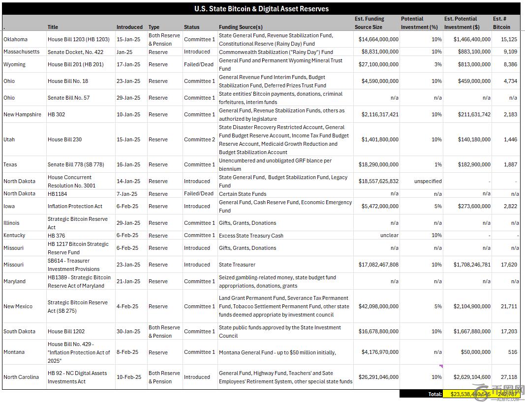 马萨诸塞州,俄亥俄州,德克萨斯州,伊利诺伊州,亚利桑那州,爱荷华州,马里兰州,新墨西哥州北卡罗来纳州和佛罗里达州等比特币储备金,如下图所示,还有更多(例如犹他州和蒙大拿州)正在辩论起草他们的起草。