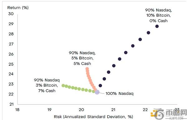 基于这些特性,在包含纳斯达克100指数头寸的投资组合中,配置比特币和现金可能有助于提高预期收益、**风险或超越“有效前沿”——即在不增加波动性的情况下实现更高的预期收益。以下假设分析探讨了将10%的纳斯达克100指数配置转移至比特币和现金组合对投资组合的影响: