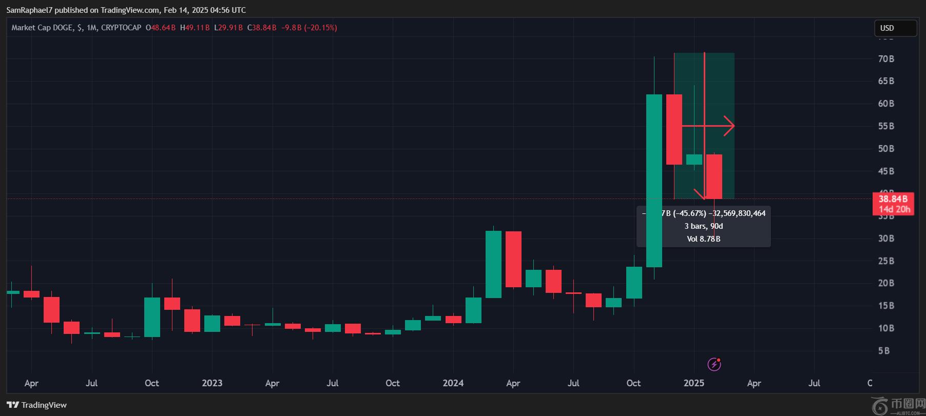 值得注意的是,更广泛的市场对狗狗 价格及其市值。 狗狗的市值飙升至2024年12月的3年峰值710亿美元,现在在发稿时跌至389亿美元。这标志着三个月内发生45%的崩溃。