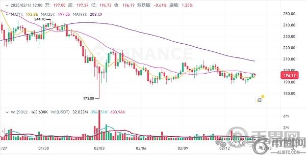 截至本文撰写时,SOL 价格小幅下跌 0.5%,目前为 196.74 美元。该**的盘中**价和**价分别为 189.43 美元和 197.31 美元。