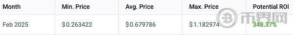 CoinCodex 表示,狗狗币达到 2 美元的可能性很小。预计今年狗狗币的**交易价格为 1.182974 美元。这比目前的价格大幅上涨了 348%。据报道,狗狗币将在 2025 年 2 月达到这一峰值。重要的是要记住,狗狗币在四年前的 2021 年达到了 0.7376 美元的峰值。目前,狗狗币的交易价格比其**价低了 64%。