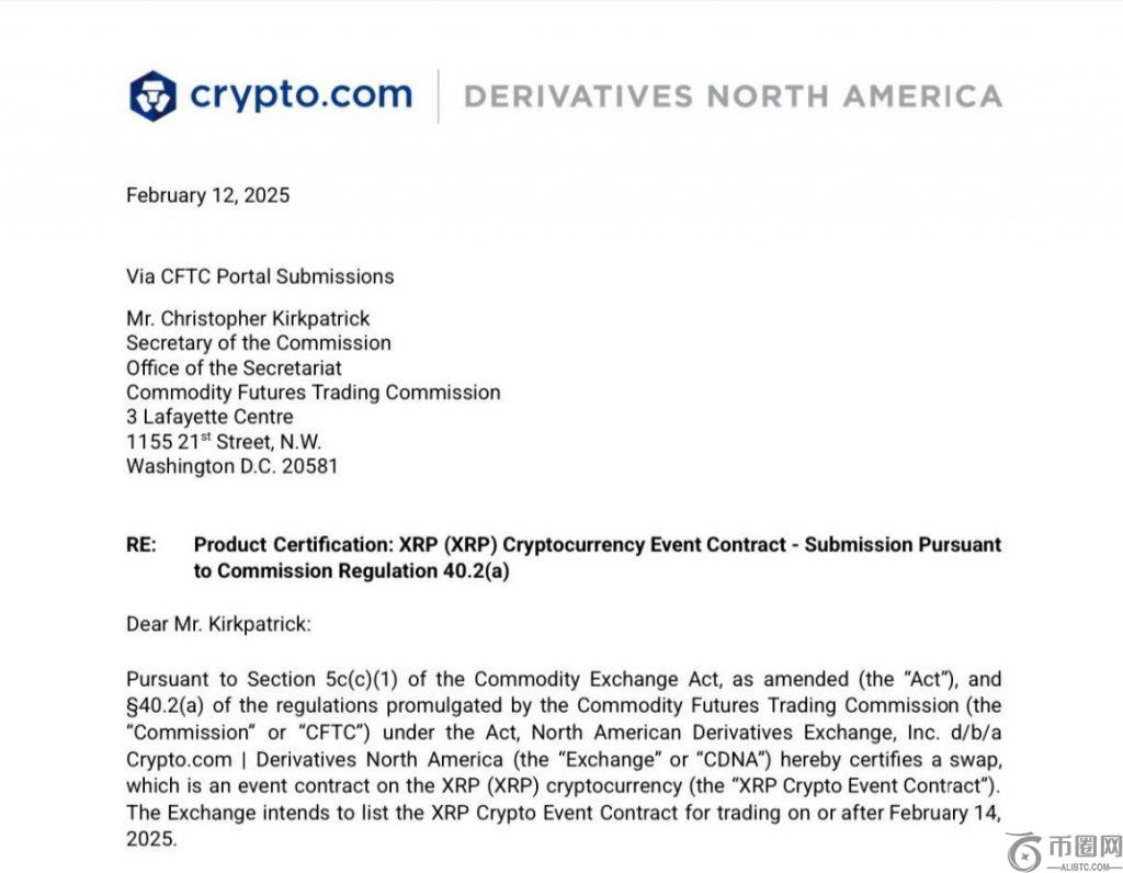 Crypto.com衍生品北美(CDNA)于2月12日向CFTC提交了XRP衍生品列表认证。该新仪器补充了该平台现有的现有现货交易产品,并扩大了北美贸易商的加密货币交换期权。
