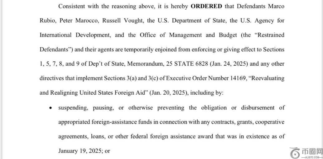 阿里法官批准了原告要求临时限制令的请求。他允许在1月20日之前签署的外国援助合同恢复。但是,他不再阻止行政命令本身,并指出目前不必终止命令。
