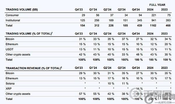 Coinbase在2024年交易量同比增长的大部分原因是加密资产波动性水平上升(尤其是在**季度和第四季度)以及加密资产平均价格上涨。支撑这些更强劲宏观经济因素的两个主要因素是 2024 年**季度推出比特币 ETF 产品,以及 2024 年第四季度选出支持加密货币的总统和国会以及相关的监管清晰度预期,这两者都导致现货加密交易活动增加。