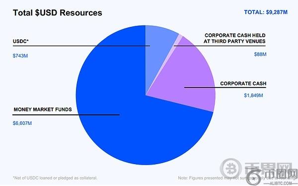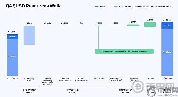 在资本和流动性上,Coinbase第四季度末,美元资源为 93 亿美元,美元资源被定义为现金和现金等价物以及 USDC(扣除作为抵押品借出的或质押的美元)。美元资源环比增长 13% 至 11 亿美元。