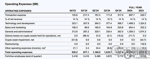 2024 年总运营费用为 43 亿美元,同比增长 30% 至 10 亿美元。技术与开发、一般与行政以及销售与营销费用合计同比增长25% 至 6.92 亿美元 。增长主要得益于可变领域支出的增加,尤其是 USDC 奖励支出和营销费用以及更高的股票薪酬和政策支出,因为加大了加密货币宣传力度。年底拥有 3,772 名全职员工,同比增长 10%。