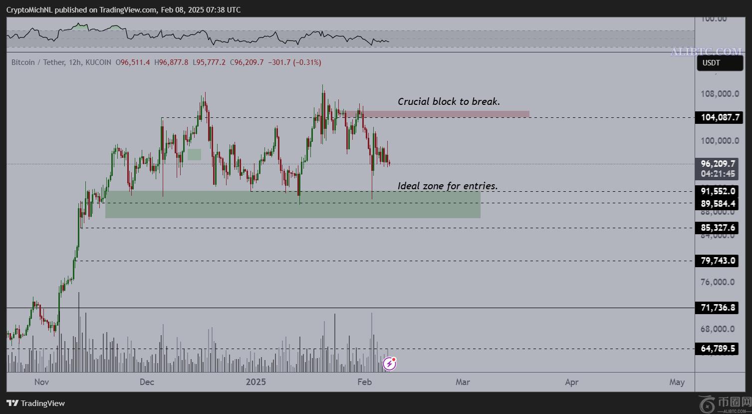 与 caueconomy 一样,分析师 Michaël van de Poppe 也认为 BTC 可能很快反弹至新高。根据 van de Poppe 的说法,最近的价格下跌可能是一个很好的切入点,可能会推动其创下历史新高,如上图所示。