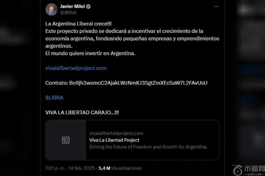 星期五,麦莉(Milei)在X上发布了大约$ libra,强调了其“通过资助小型企业和初创企业来鼓励经济增长的潜力”。