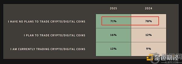 实际上,“跟随策略”正成为越来越多机构的选择。根据摩根大通(JPMorgan)的一项**调查,今年表示“没有计划”参与加密货币交易的机构交易员比例已从去年的78%下降至71%。这意味着,2025年可能会有7%的机构交易员开始涉足加密货币交易,届时将有29%的机构交易员进入这一领域。