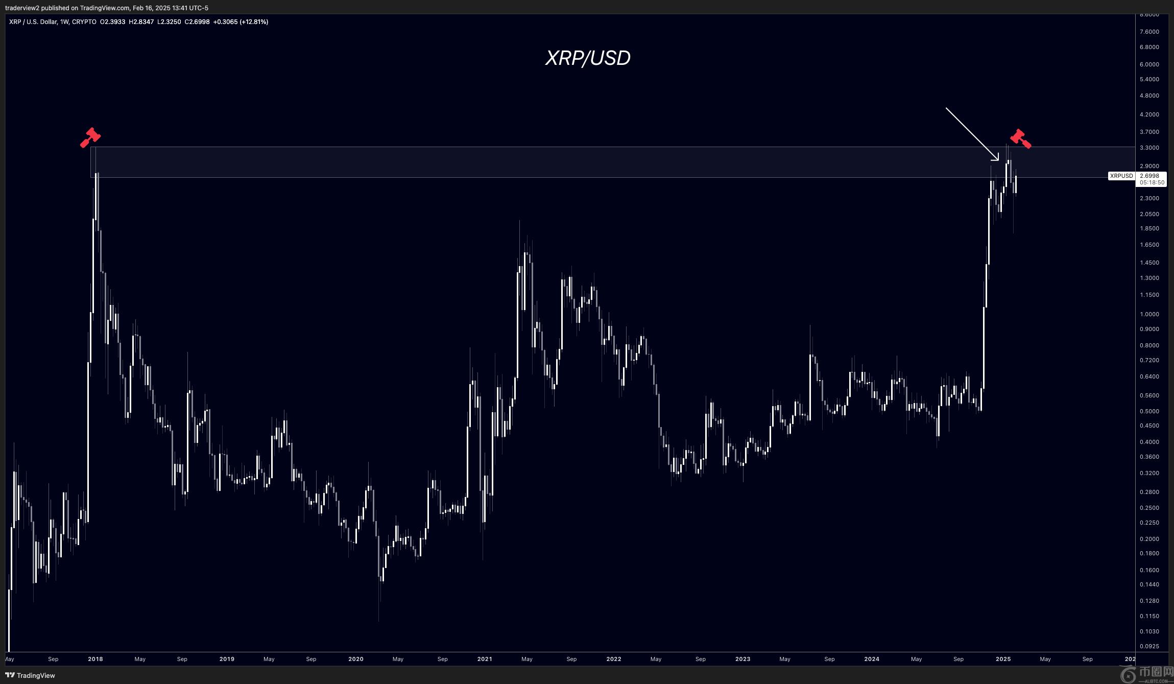 同时,XRP最重要的阻力水平保持在3.15美元至3.50美元之间。正如他以前的分析上个月,XRP最近在去年11月开始的跑步后面重新测试了该区域。但是,阻力是强大的。