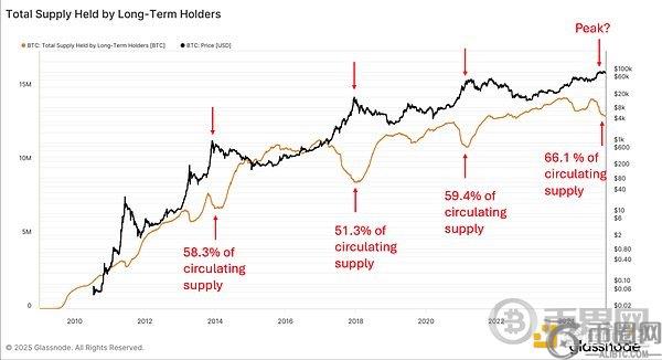 *回顾上一周期,起初有67.2%的供应量由长期持有者掌握。当市场达到**时,这一比例降至59.4%,减少了7.8%。