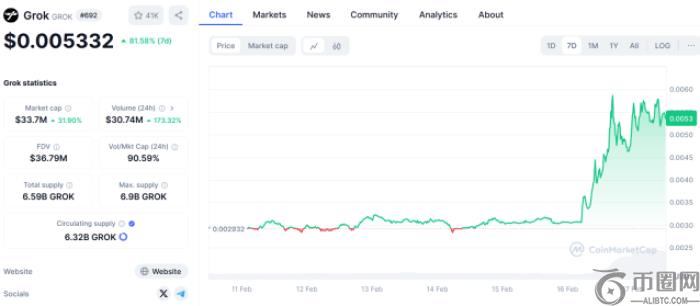 $ Grok是增长81%在上周,市值为3400万美元,**价格为0.005331美元。自昨天以来,该图表也一直在看上去确实是看好的。