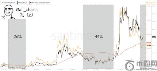 加密分析师阿里·马丁内斯(Ali Martinez)建议,狗狗币在短期内仍处于进一步的价格崩溃的风险。在X帖子中,分析师透露,Doge刚刚看到实现价值的市场价值(MVRV)及其200天移动平均线(MA)。他进一步指出,在**两次发生的**两次,价格下跌了26%和44%。