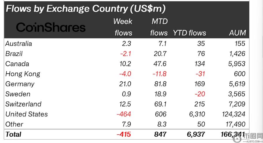 美国市场首当其冲的撤军,流出了4.64亿美元。同时,其他地区仍然具有正面的弹性。具体来说,德国的加密ETP市场记录了2100万美元的流入,瑞士的流入率为1,250万美元,加拿大的流入量为1020万加元。