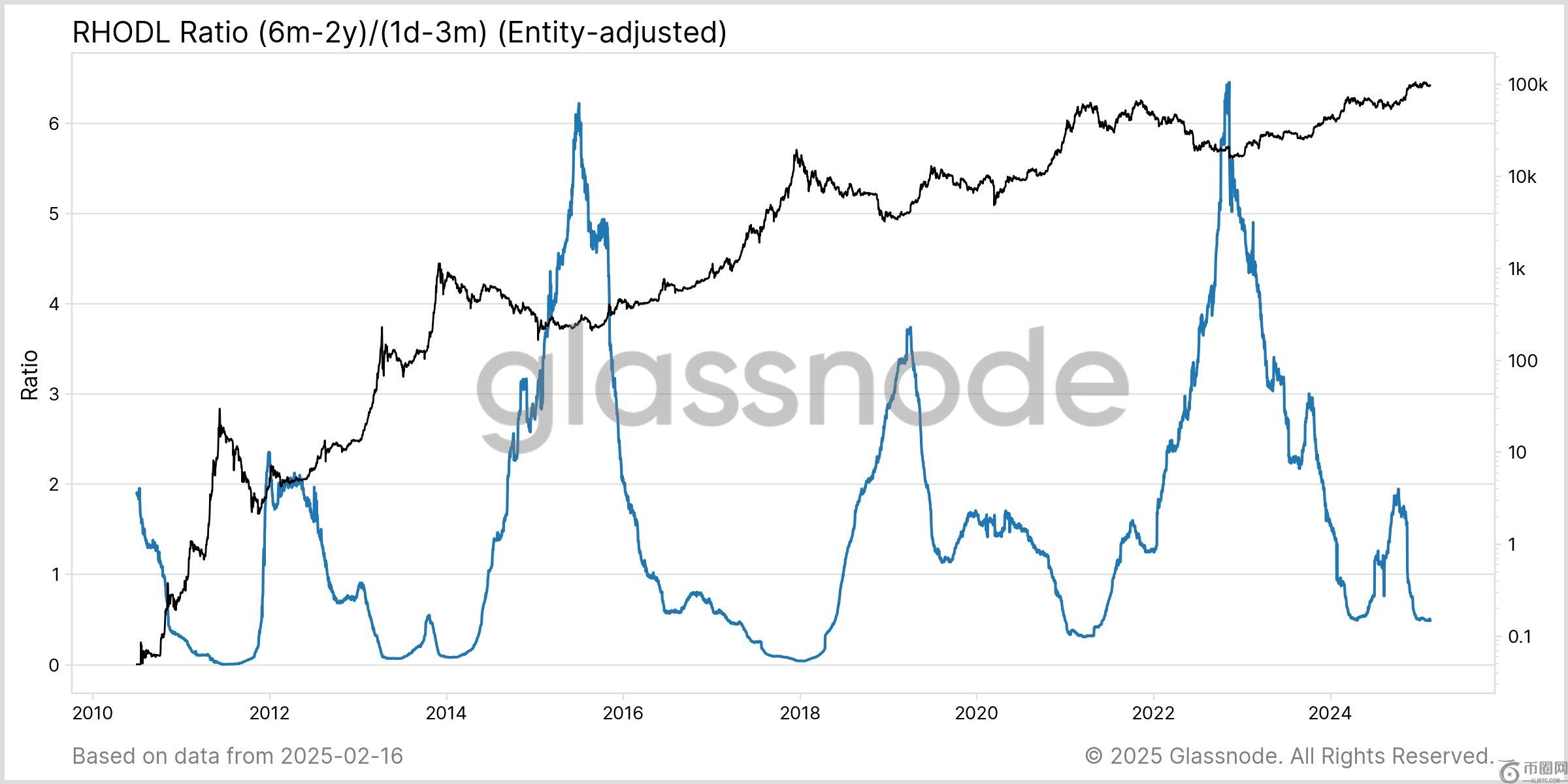在社交媒体平台x上发布,GlassNode查看了Rhodl的比率,该公司说,该比率通过比较中周期持有人的数量来帮助识别比特币市场周期的拐点 - 那些在六个月和两年之间持有硬币的人的数量 - 给新的参赛者 - 那些在一天到三个月之间的人。