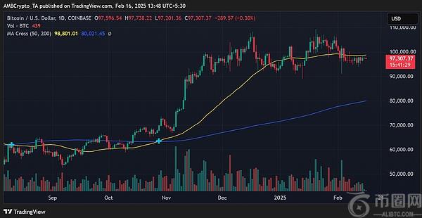 从技术分析角度来看,比特币的价格走势保持相对稳定。截至撰写本文时,BTC交易价格略低于50天移动平均线(约98,801美元),而200天移动平均线则位于80,021美元,为长期走势提供了坚实支撑。