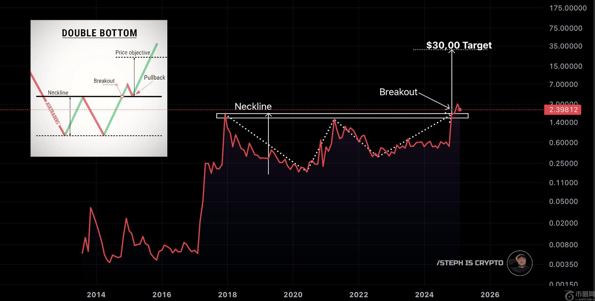 对于双底突破要有效,价格必须超过构造的领口,对其进行重新测试,然后移动更高。根据斯蒂芬的说法,XRP已成功**了这一领口,现在正处于可以展开抛物线会议的阶段。