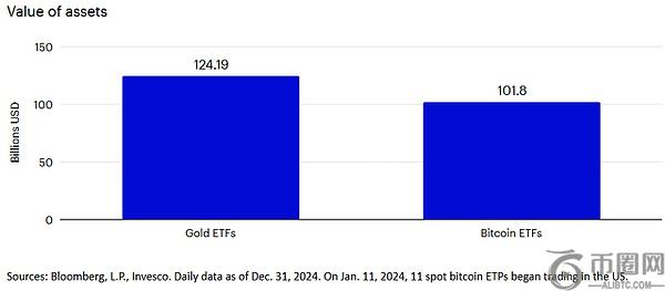 随着比特币市值的不断增长,投资者对这款龙头加密资产的态度也在不断转变。2024年1月,美国推出了广泛可接触的现货比特币交易产品(ETF),这标志着一个重要的里程碑,世界**资本市场为投资者提供了一个便捷的途径,让他们能够轻松投资比特币(未来可能还包括以太坊)。例如,截至2024年1月11日,美国投资者已经向现货比特币ETF投资了406亿美元,到2024年底,这一产品的总资产达到了1018亿美元。相比之下,黄金ETF的管理资产为1242亿美元。