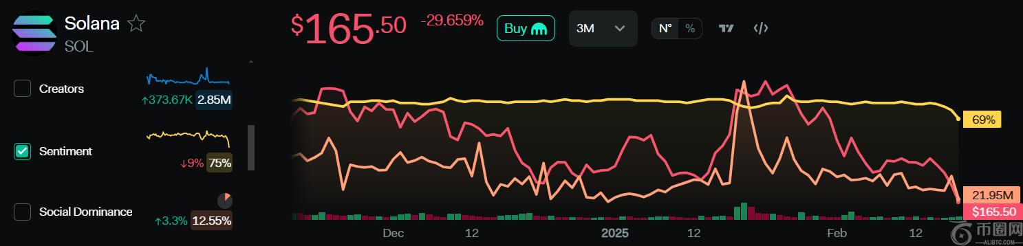 自备受争议的令牌推出以来,索拉纳的价格从撰写本文的价格下降了17%以上的价格略低于200美元降至近166美元。同时,社会参与度从约3400万人下降了35%,至刚低于2200万。此外,情绪从82%下降到69%。