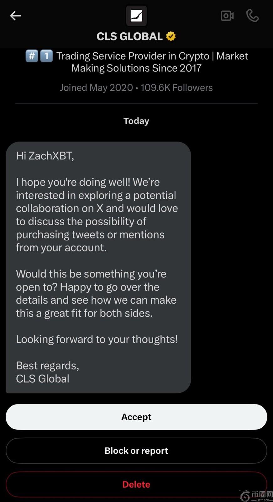 zachxbt,回复今天,该平台今天2月14日的“情人节**日”帖子分享了CLS Global的信息的屏幕截图,要求他“在X上进行潜在的合作”。