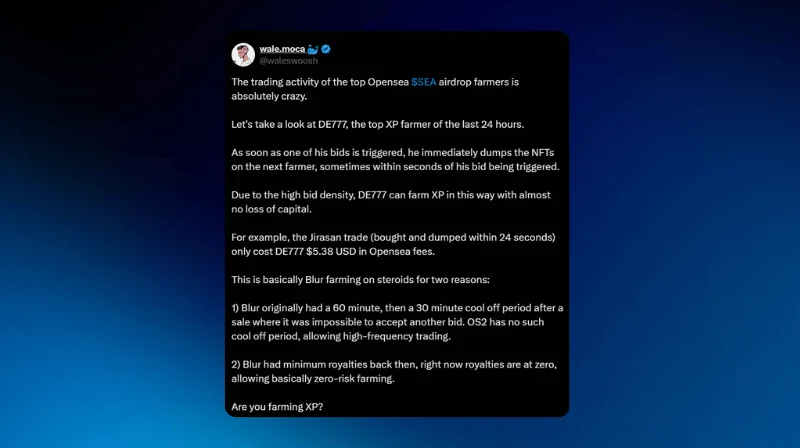 争议的核心是Opensea的XP系统,该系统奖励交易者放置出价和上市NFT,而不是进行真实的购买。这导致了高频交易的**,**XP农民在几秒钟内翻转NFT,推动市场人工高的数量,同时对NFT地板价格造成重大损害。