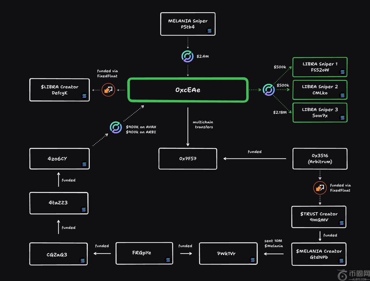 这意味着梅拉尼亚(Melania)的创造者(或与团队亲密的人)抢夺了自己的发射。我们密切关注此地址以跟踪他们的活动。几周后,我们注意到0xcea是资助Defcyk,天秤座。是的,天秤座的创作者兑现了8700万美元。