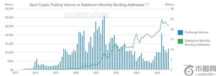 报告中指出:“虽然它们最初是作为交易者和交易所的加密原生抵押品类型和结算媒介出现的,但它们已经跨越了鸿沟,并在全球普通经济中得到广泛应用。基于稳定币活动和加密货币市场周期之间的差异,很明显稳定币的采用已经超越了仅仅服务加密货币用户和交易用例的范围。”