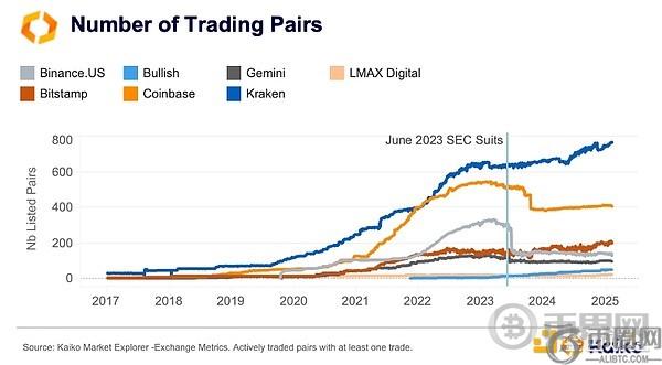 下图显示,在 2023 年 6 月美国证券交易委员会对这两个平台提**讼后,Binance.US 和 Coinbase 上活跃交易对的数量急剧下降。然而,如果监管环境改善,这种情况可能会改变,从而可能增加 Coinbase 对散户交易者的吸引力。