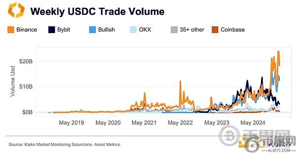 Bullish 已成为一个强大的竞争对手,目前以 32% 的 USDC 市场份额与币安一较高下。