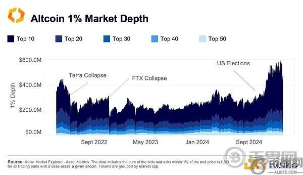 自美国大选以来,山寨币的前景和情绪有所改善,推动了新山寨币 ETF 申请浪潮和交易活动的激增。自 9 月以来,山寨币的每日流动性(以前 50 种**的 1% 市场深度衡量)几乎翻了一番,达到 9.6 亿美元。