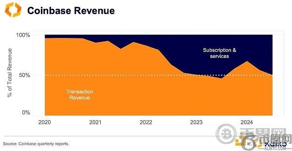 过去几年,Coinbase 的业务已多元化,扩展到交易以外的领域,来自“订阅和服务”的收入(包括区块链奖励、托管费和 USDC 利息)占其总收入的比例急剧上升。