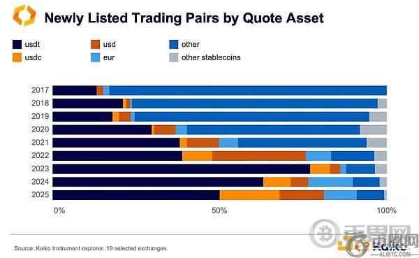这种转变与新上市的 USDT 报价对份额的普遍下降同时发生,从 2023 年占总上市量的 77% 下降到 2024 年的 63% 以下,到 2025 年迄今为止仅为 50%——这表明稳定币之间的竞争愈演愈烈。