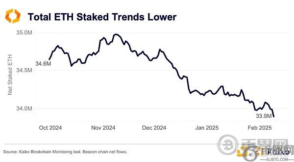 使用 Kaiko 的区块链监控工具,我们可以看到以太坊信标链上的净流量在第四季度下降。Coinbase 目前是仅次于 Lido 的第二大 ETH 质押实体,是导致这一下降的**因素之一。在过去六个月中,该交易所在质押市场的份额下降了 3.8%,在此期间净流出 129 万 ETH。