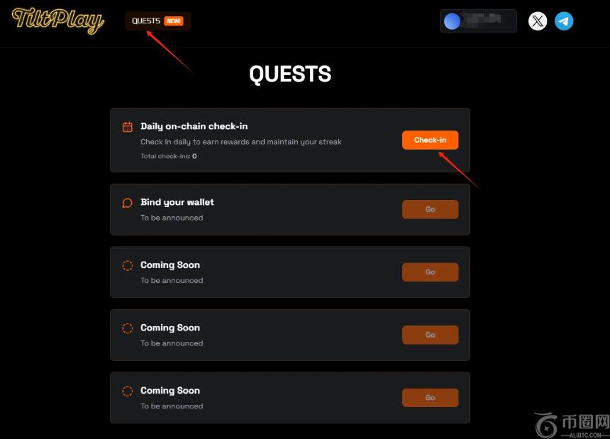STEP 7. 进入交互网站(链接:https://www.tiltplay.gg/)后连接钱包,点击“QUESTS”,选择**个签到任务后点击“Check-in”即可。