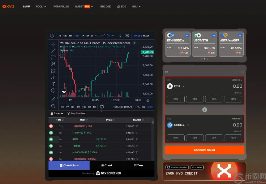 STEP 4. 进入交互网站(链接:https://app.kyo.finance/swap)后连接钱包,将 ETH(价值超过 5 美元)兑换为 USDC.e。