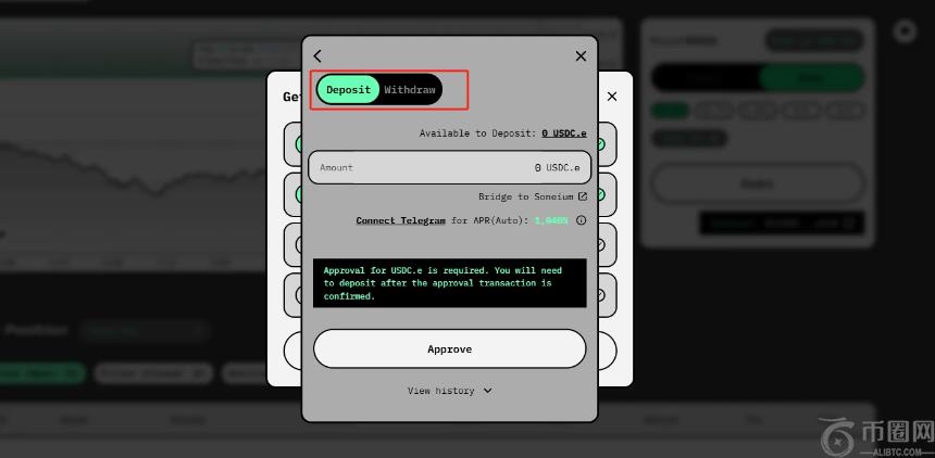 STEP 5. 进入交互网站(链接:https://supervol.io/trade)后连接钱包,击右上角的 Deposit,存入 USDC.e。
