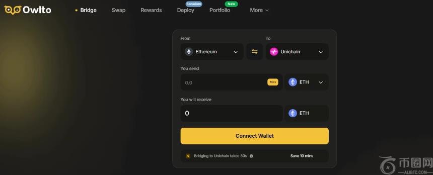 STEP 1. 跨链:通过跨链桥(链接:https://owlto.finance/),将少量 ETH 或其他资产(如 USDT、USDC)从以太坊主网或其他以太坊二层网络跨至 Unichain 网络,或从 Unichain 网络跨回至其他网络。
