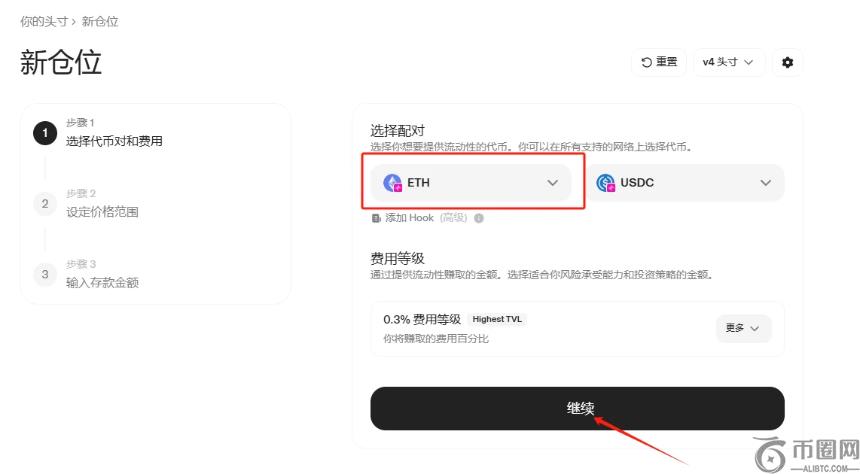 STEP 3. 添加流动性(链接:https://app.uniswap.org/positions/create):选择 Unichain 的 ETH 后再选择一种资产后点击“继续”,默认“全区间”,**输入存入**数量即可。